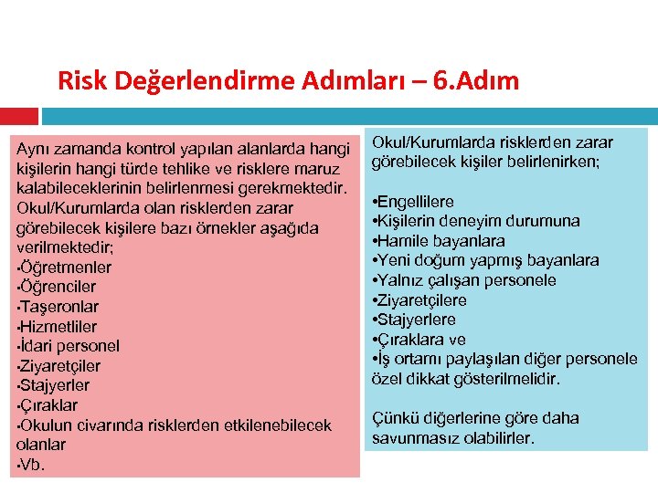Risk Değerlendirme Adımları – 6. Adım Aynı zamanda kontrol yapılan alanlarda hangi kişilerin hangi türde tehlike ve risklere maruz kalabileceklerinin belirlenmesi gerekmektedir. Okul/Kurumlarda olan risklerden zarar görebilecek kişilere bazı örnekler aşağıda verilmektedir; • Öğretmenler • Öğrenciler • Taşeronlar • Hizmetliler • İdari personel • Ziyaretçiler • Stajyerler • Çıraklar • Okulun civarında risklerden etkilenebilecek olanlar • Vb. Okul/Kurumlarda risklerden zarar görebilecek kişiler belirlenirken; • Engellilere • Kişilerin deneyim durumuna • Hamile bayanlara • Yeni doğum yapmış bayanlara • Yalnız çalışan personele • Ziyaretçilere • Stajyerlere • Çıraklara ve • İş ortamı paylaşılan diğer personele özel dikkat gösterilmelidir. Çünkü diğerlerine göre daha savunmasız olabilirler.