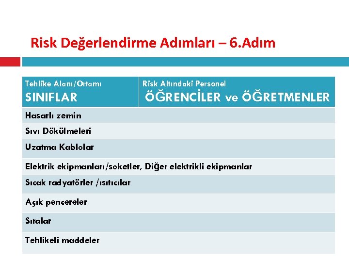 Risk Değerlendirme Adımları – 6. Adım Tehlike Alanı/Ortamı Risk Altındaki Personel SINIFLAR ÖĞRENCİLER ve ÖĞRETMENLER Hasarlı zemin Sıvı Dökülmeleri Uzatma Kablolar Elektrik ekipmanları/soketler, Diğer elektrikli ekipmanlar Sıcak radyatörler /ısıtıcılar Açık pencereler Sıralar Tehlikeli maddeler