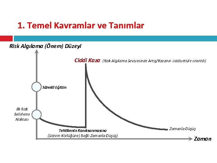1. Temel Kavramlar ve Tanımlar Risk Algılama (Önem) Düzeyi Ciddi Kaza (Risk Algılama Seviyesinde Artış/Kazanın ciddiyetiyle orantılı) Sürekli Eğitim İlk Risk Belirleme Noktası Tehlikenin Kanıksanmasına (Sistem Körlüğüne) Bağlı Zamanla Düşüş) Zamanla Düşüş Zaman