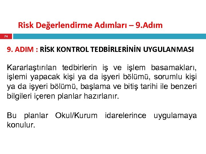 Risk Değerlendirme Adımları – 9. Adım 74 9. ADIM : RİSK KONTROL TEDBİRLERİNİN UYGULANMASI Kararlaştırılan tedbirlerin iş ve işlem basamakları, işlemi yapacak kişi ya da işyeri bölümü, sorumlu kişi ya da işyeri bölümü, başlama ve bitiş tarihi ile benzeri bilgileri içeren planlar hazırlanır. Bu planlar Okul/Kurum idarelerince uygulamaya konulur.