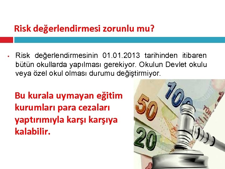 Risk değerlendirmesi zorunlu mu? § Risk değerlendirmesinin 01. 2013 tarihinden itibaren bütün okullarda yapılması gerekiyor. Okulun Devlet okulu veya özel okul olması durumu değiştirmiyor. Bu kurala uymayan eğitim kurumları para cezaları yaptırımıyla karşıya kalabilir.