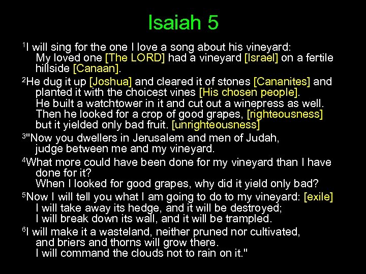 Isaiah 5 1 I will sing for the one I love a song about his vineyard: My loved one [The LORD] had a vineyard [Israel] on a fertile hillside [Canaan]. 2 He dug it up [Joshua] and cleared it of stones [Cananites] and planted it with the choicest vines [His chosen people]. He built a watchtower in it and cut out a winepress as well. Then he looked for a crop of good grapes, [righteousness] but it yielded only bad fruit. [unrighteousness] 3"Now you dwellers in Jerusalem and men of Judah, judge between me and my vineyard. 4 What more could have been done for my vineyard than I have done for it? When I looked for good grapes, why did it yield only bad? 5 Now I will tell you what I am going to do to my vineyard: [exile] I will take away its hedge, and it will be destroyed; I will break down its wall, and it will be trampled. 6 I will make it a wasteland, neither pruned nor cultivated, and briers and thorns will grow there. I will command the clouds not to rain on it. "