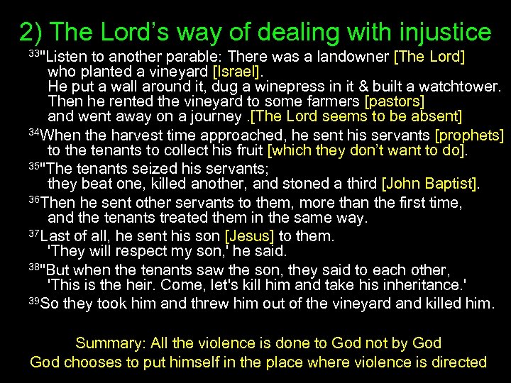 2) The Lord’s way of dealing with injustice 33"Listen to another parable: There was a landowner [The Lord] who planted a vineyard [Israel]. He put a wall around it, dug a winepress in it & built a watchtower. Then he rented the vineyard to some farmers [pastors] and went away on a journey. [The Lord seems to be absent] 34 When the harvest time approached, he sent his servants [prophets] to the tenants to collect his fruit [which they don’t want to do]. 35"The tenants seized his servants; they beat one, killed another, and stoned a third [John Baptist]. 36 Then he sent other servants to them, more than the first time, and the tenants treated them in the same way. 37 Last of all, he sent his son [Jesus] to them. 'They will respect my son, ' he said. 38"But when the tenants saw the son, they said to each other, 'This is the heir. Come, let's kill him and take his inheritance. ' 39 So they took him and threw him out of the vineyard and killed him. Summary: All the violence is done to God not by God chooses to put himself in the place where violence is directed