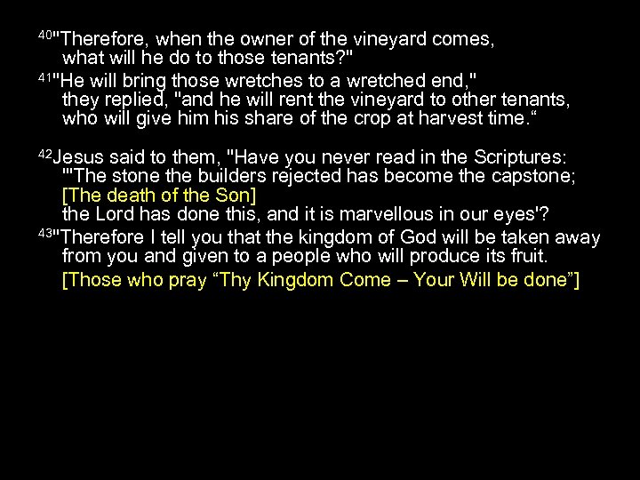 40"Therefore, when the owner of the vineyard comes, what will he do to those tenants? " 41"He will bring those wretches to a wretched end, " they replied, "and he will rent the vineyard to other tenants, who will give him his share of the crop at harvest time. “ 42 Jesus said to them, "Have you never read in the Scriptures: "'The stone the builders rejected has become the capstone; [The death of the Son] the Lord has done this, and it is marvellous in our eyes'? 43"Therefore I tell you that the kingdom of God will be taken away from you and given to a people who will produce its fruit. [Those who pray “Thy Kingdom Come – Your Will be done”]