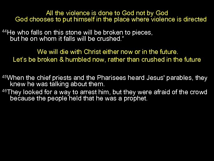 All the violence is done to God not by God chooses to put himself in the place where violence is directed 44 He who falls on this stone will be broken to pieces, but he on whom it falls will be crushed. “ We will die with Christ either now or in the future. Let’s be broken & humbled now, rather than crushed in the future 45 When the chief priests and the Pharisees heard Jesus' parables, they knew he was talking about them. 46 They looked for a way to arrest him, but they were afraid of the crowd because the people held that he was a prophet.