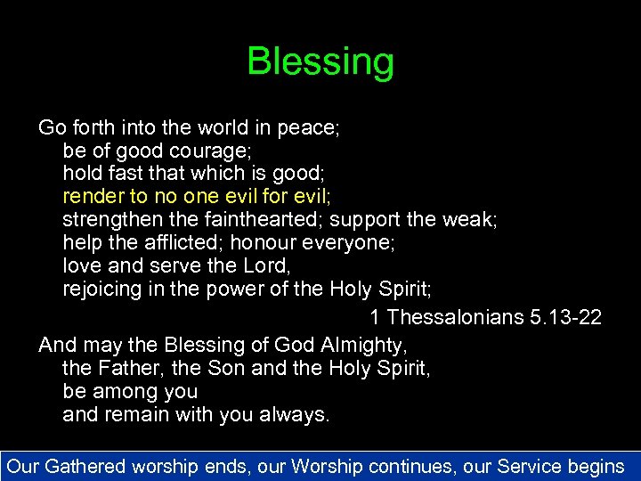 Blessing Go forth into the world in peace; be of good courage; hold fast that which is good; render to no one evil for evil; strengthen the fainthearted; support the weak; help the afflicted; honour everyone; love and serve the Lord, rejoicing in the power of the Holy Spirit; 1 Thessalonians 5. 13 -22 And may the Blessing of God Almighty, the Father, the Son and the Holy Spirit, be among you and remain with you always. Our Gathered worship ends, our Worship continues, our Service begins