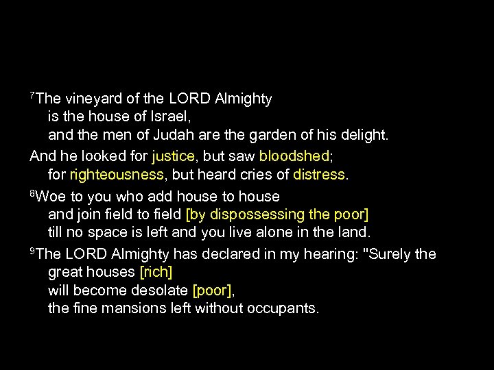7 The vineyard of the LORD Almighty is the house of Israel, and the men of Judah are the garden of his delight. And he looked for justice, but saw bloodshed; for righteousness, but heard cries of distress. 8 Woe to you who add house to house and join field to field [by dispossessing the poor] till no space is left and you live alone in the land. 9 The LORD Almighty has declared in my hearing: "Surely the great houses [rich] will become desolate [poor], the fine mansions left without occupants.