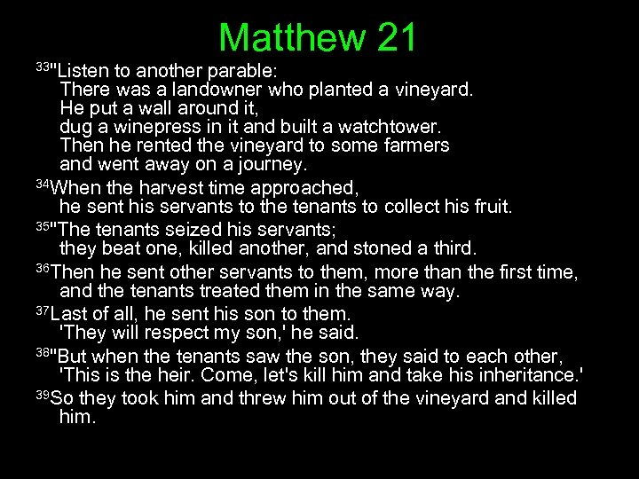 Matthew 21 33"Listen to another parable: There was a landowner who planted a vineyard. He put a wall around it, dug a winepress in it and built a watchtower. Then he rented the vineyard to some farmers and went away on a journey. 34 When the harvest time approached, he sent his servants to the tenants to collect his fruit. 35"The tenants seized his servants; they beat one, killed another, and stoned a third. 36 Then he sent other servants to them, more than the first time, and the tenants treated them in the same way. 37 Last of all, he sent his son to them. 'They will respect my son, ' he said. 38"But when the tenants saw the son, they said to each other, 'This is the heir. Come, let's kill him and take his inheritance. ' 39 So they took him and threw him out of the vineyard and killed him.