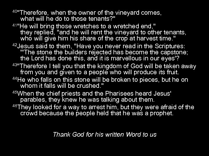 40"Therefore, when the owner of the vineyard comes, what will he do to those tenants? " 41"He will bring those wretches to a wretched end, " they replied, "and he will rent the vineyard to other tenants, who will give him his share of the crop at harvest time. " 42 Jesus said to them, "Have you never read in the Scriptures: "'The stone the builders rejected has become the capstone; the Lord has done this, and it is marvellous in our eyes'? 43"Therefore I tell you that the kingdom of God will be taken away from you and given to a people who will produce its fruit. 44 He who falls on this stone will be broken to pieces, but he on whom it falls will be crushed. " 45 When the chief priests and the Pharisees heard Jesus' parables, they knew he was talking about them. 46 They looked for a way to arrest him, but they were afraid of the crowd because the people held that he was a prophet. Thank God for his written Word to us