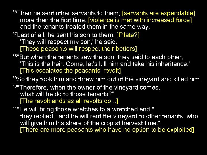 36 Then he sent other servants to them, [servants are expendable] more than the first time, [violence is met with increased force] and the tenants treated them in the same way. 37 Last of all, he sent his son to them. [Pilate? ] 'They will respect my son, ' he said. [These peasants will respect their betters] 38"But when the tenants saw the son, they said to each other, 'This is the heir. Come, let's kill him and take his inheritance. ‘ [This escalates the peasants’ revolt] 39 So they took him and threw him out of the vineyard and killed him. 40"Therefore, when the owner of the vineyard comes, what will he do to those tenants? “ [The revolt ends as all revolts do. . ] 41"He will bring those wretches to a wretched end, " they replied, "and he will rent the vineyard to other tenants, who will give him his share of the crop at harvest time. “ [There are more peasants who have no option to be exploited]