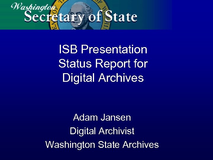ISB Presentation Status Report for Digital Archives Adam Jansen Digital Archivist Washington State Archives