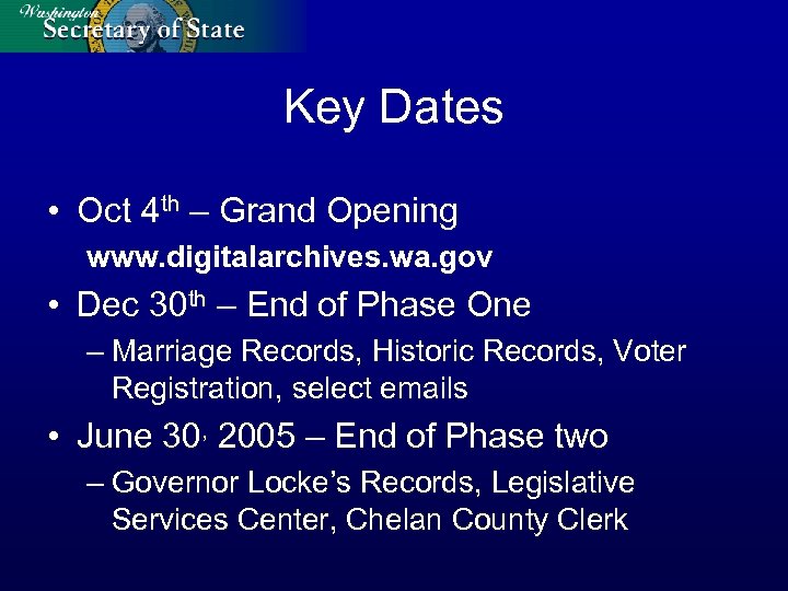 Key Dates • Oct 4 th – Grand Opening www. digitalarchives. wa. gov • Dec 30 th – End of Phase One – Marriage Records, Historic Records, Voter Registration, select emails • June 30, 2005 – End of Phase two – Governor Locke’s Records, Legislative Services Center, Chelan County Clerk