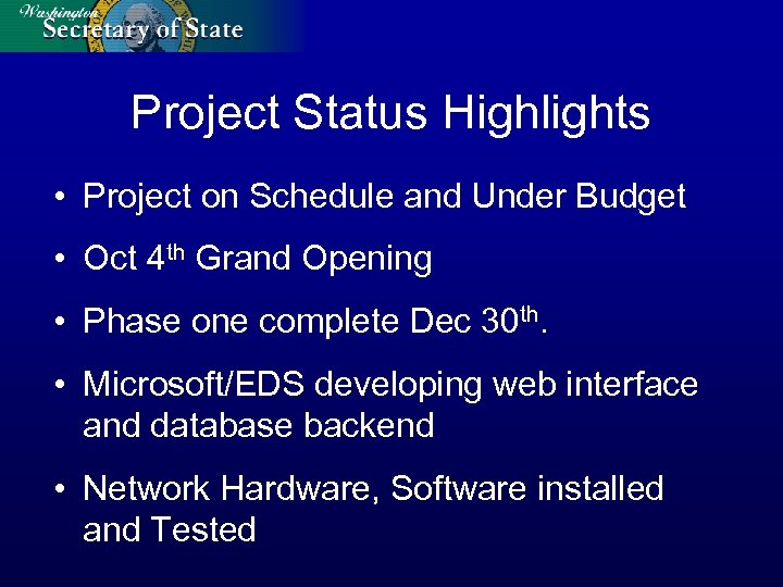 Project Status Highlights • Project on Schedule and Under Budget • Oct 4 th Grand Opening • Phase one complete Dec 30 th. • Microsoft/EDS developing web interface and database backend • Network Hardware, Software installed and Tested