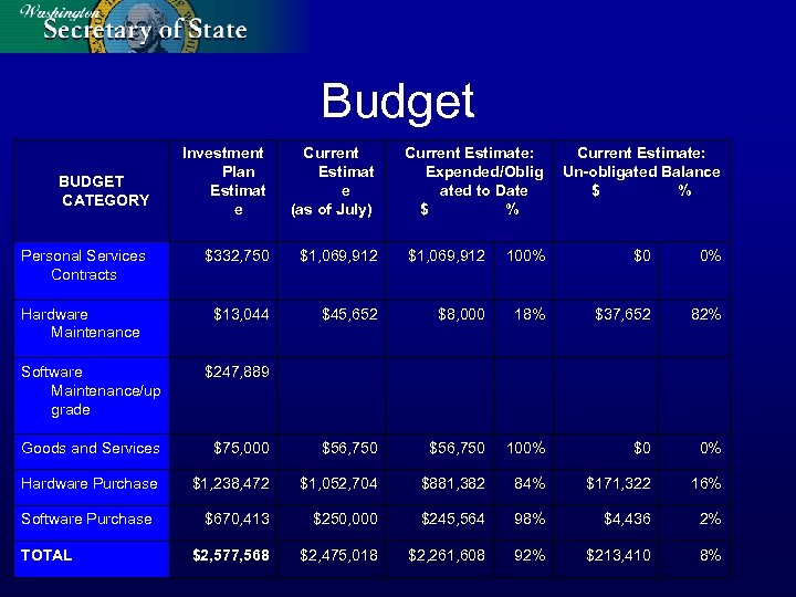 Budget Investment Plan Estimat e Current Estimat e (as of July) Personal Services Contracts $332, 750 $1, 069, 912 100% $0 0% Hardware Maintenance $13, 044 $45, 652 $8, 000 18% $37, 652 82% BUDGET CATEGORY Current Estimate: Expended/Oblig ated to Date $ % Current Estimate: Un-obligated Balance $ % Software Maintenance/up grade $247, 889 Goods and Services $75, 000 $56, 750 100% $0 0% Hardware Purchase $1, 238, 472 $1, 052, 704 $881, 382 84% $171, 322 16% $670, 413 $250, 000 $245, 564 98% $4, 436 2% $2, 577, 568 $2, 475, 018 $2, 261, 608 92% $213, 410 8% Software Purchase TOTAL