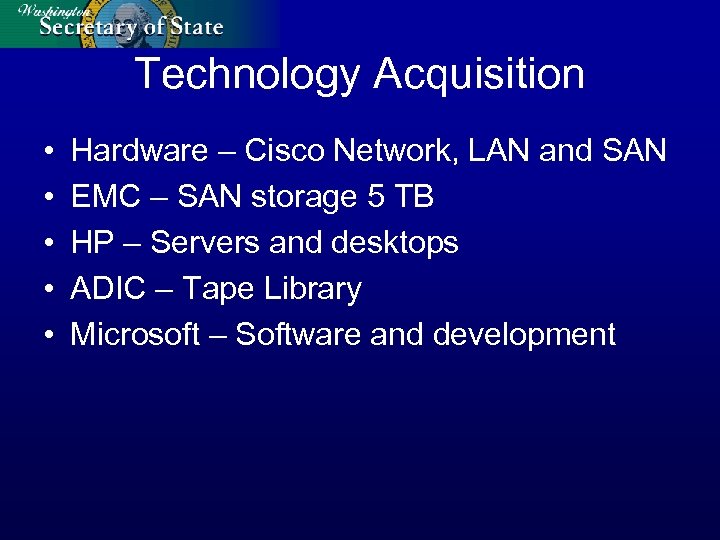 Technology Acquisition • • • Hardware – Cisco Network, LAN and SAN EMC – SAN storage 5 TB HP – Servers and desktops ADIC – Tape Library Microsoft – Software and development