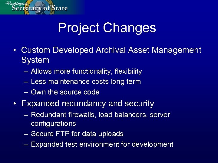 Project Changes • Custom Developed Archival Asset Management System – Allows more functionality, flexibility – Less maintenance costs long term – Own the source code • Expanded redundancy and security – Redundant firewalls, load balancers, server configurations – Secure FTP for data uploads – Expanded test environment for development