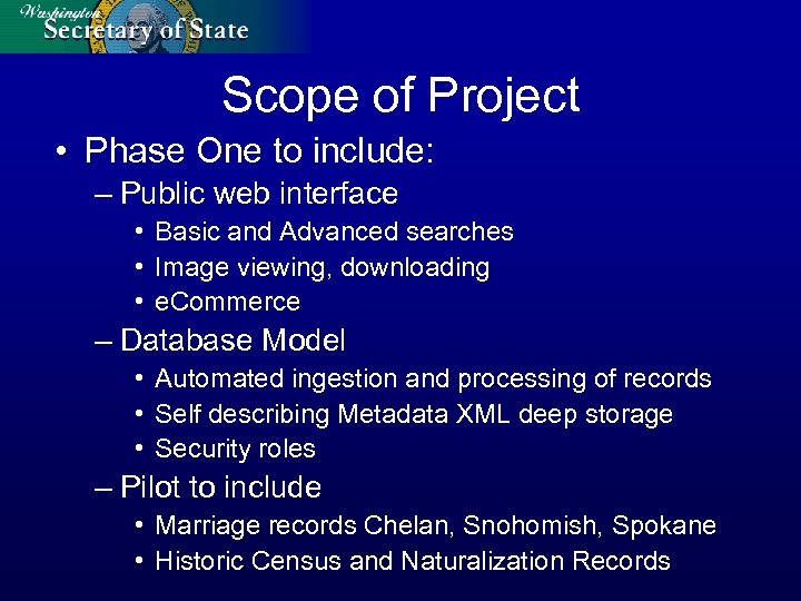 Scope of Project • Phase One to include: – Public web interface • Basic and Advanced searches • Image viewing, downloading • e. Commerce – Database Model • Automated ingestion and processing of records • Self describing Metadata XML deep storage • Security roles – Pilot to include • Marriage records Chelan, Snohomish, Spokane • Historic Census and Naturalization Records