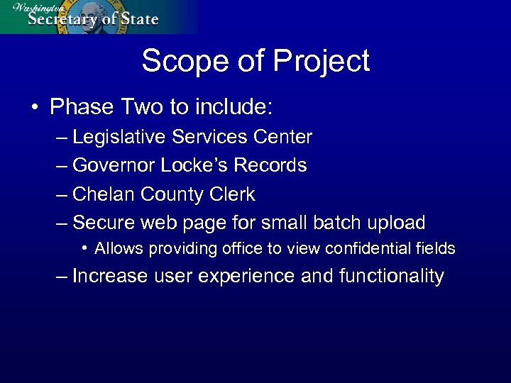 Scope of Project • Phase Two to include: – Legislative Services Center – Governor Locke’s Records – Chelan County Clerk – Secure web page for small batch upload • Allows providing office to view confidential fields – Increase user experience and functionality