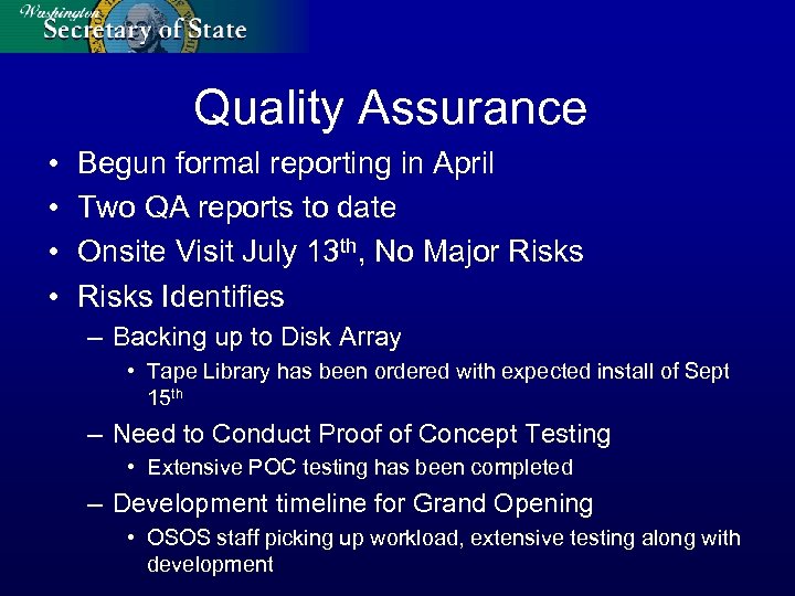 Quality Assurance • • Begun formal reporting in April Two QA reports to date Onsite Visit July 13 th, No Major Risks Identifies – Backing up to Disk Array • Tape Library has been ordered with expected install of Sept 15 th – Need to Conduct Proof of Concept Testing • Extensive POC testing has been completed – Development timeline for Grand Opening • OSOS staff picking up workload, extensive testing along with development