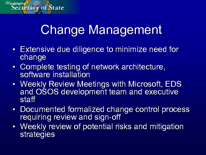 Change Management • Extensive due diligence to minimize need for change • Complete testing of network architecture, software installation • Weekly Review Meetings with Microsoft, EDS and OSOS development team and executive staff • Documented formalized change control process requiring review and sign-off • Weekly review of potential risks and mitigation strategies