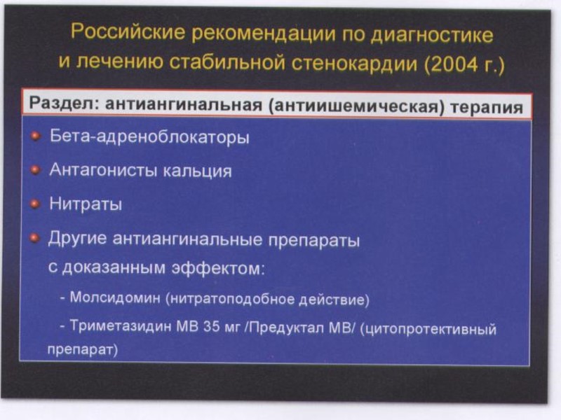 Лечение стабильной стенокардии Улучшение прогноза Антиагреганты Дезагрегантная терапия показана для предотвращения коронарного тромбоза у больных стабильной стенокардией при условии благоприятного соотношения риск/польза. Аспирин в низких дозах (75-150 мг) препарат выбора в большинстве случаев. Клопидогрель может использоваться как альтернатива у пациентов с аллергией на аспирин или в сочетании с аспирином после стентирования или после ОКС. У пациентов с желудочно- кишечными кровотечениями в анамнезе возможно использование блокаторов протонной помпы. Антикоагулянты (варфарин или ингибиторы тромбина), комбинируемые с аспирином у пациентов очень высокого риска, напр после ИМ, не показаны общей популяции больных стабильной стенокардией, при отсутствии дополнительных показаний, таких как ФП.