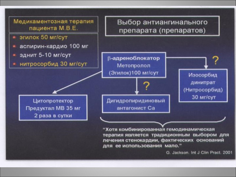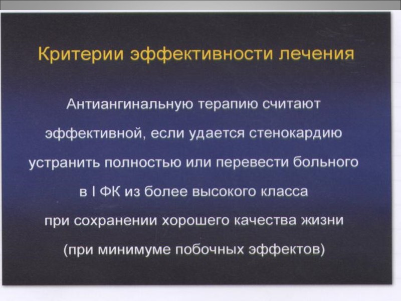 IC Оральные и трансдермальные формы Необходимо сохранять «безнитратный» период Нитраты продленного действия IC Сублингвальное применение Ситуационная профилактика Венодилатация, ↓ диастолического наполнения, ↓диастолического давления ↑ субэндокардиальной перфузии «Короткие» нитраты IA Доказанно ↓ частоту приступов, ↑ ТФН Эффективность сравнима с Β- блокаторами Особенно эффективны при коронароспазме IA Меньше побочных эффектов у β1- селективных препаратов Титрация дозы исходя из симптомов и ЧСС Доказанно ↓ частоту приступов, ↑ ТФН Могут усугублять коронароспазм Уменьшение потребности в кислороде: ↓ ЧСС, ↓ сократимости, ↓ АД Гетерогенный класс Системная и коронарная вазодилатация Верапамил и дилтиазем сократимость, ЧСС, AV- проведение. Дигидропиридиновые АК более вазоселективны Β- блокаторы Блокаторы Са каналов Рек Комментарии Действие Препарат