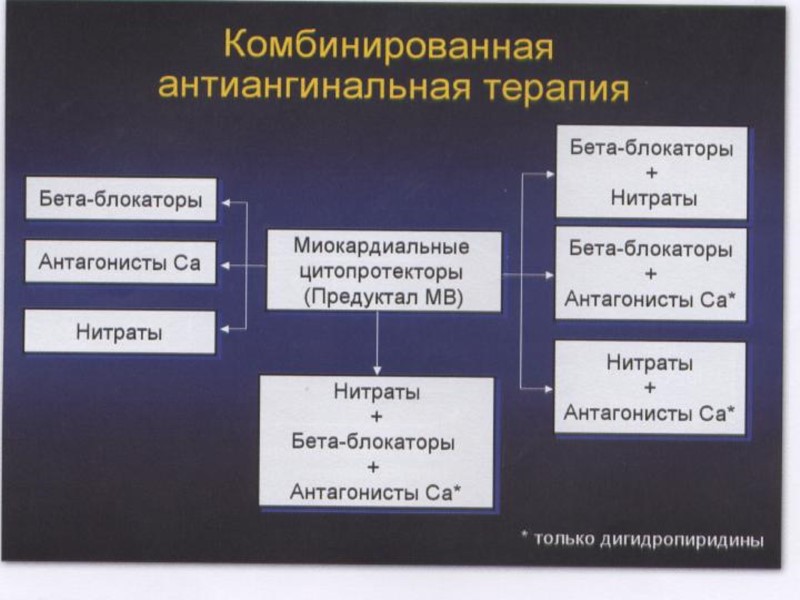 Лечение Первичные нефармакологические подходы Цели лечения Улучшение прогноза благодаря предотвращению ИМ и смерти Минимизация симптомов Пациент и его ближайшие родственники должны быть информированы происхождении стенокардии и необходимом лечении Должны быть даны рекомендации о поведении во время ангинозного приступа, объяснена необходимость купирования приступов сублингвальным приемом Ntg. Пациент информируется о побочных эффектах нитратов и необходимости их профилактического применения Донести до пациента необходимость обращения за скорой мед. помощью при персистировании симптомов более 10-20 минут в покое или неэффективности Ntg Курение сигарет должно быть строго не рекомендовано