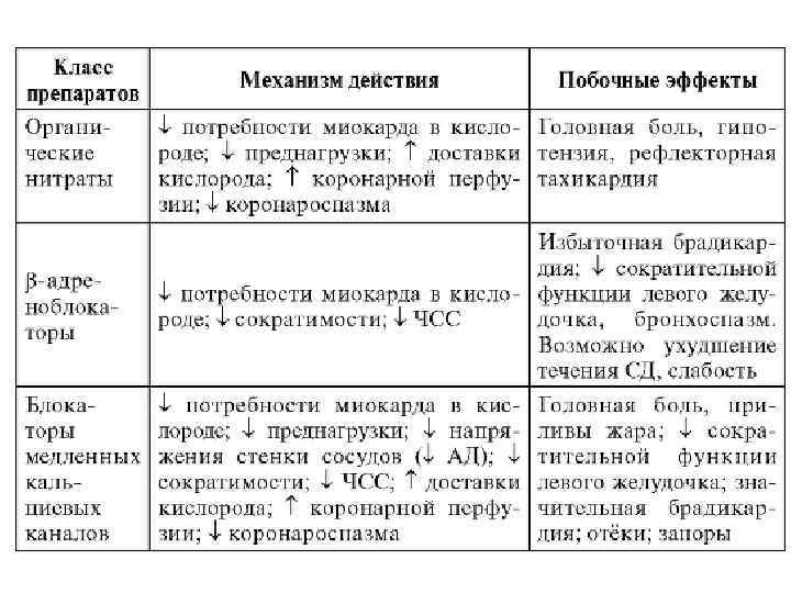 Основные группы антиангинальных средств Медикаментозное лечение стенокардии необходимо проводить в комплексе с общими мероприятиями, к которым относят назначение низкокалорийной диеты, прекращение курения, устранение гиподинамии, физических и психоэмоциональных перегрузок. В настоящее время различают три основных класса ААС: органические нитраты, β-адреноблокаторы и БМКК. Учитывая различный механизм антиангинального действия препаратов, лечение необходимо проводить с учётом тяжести, времени возникновения и особенностей клинического течения стенокардии. При ИБС применяют вспомогательные средства: антиагреганты, антикоагулянты, гиполипидемические средства и препараты, улучшающие энергетический метаболизм миокарда.