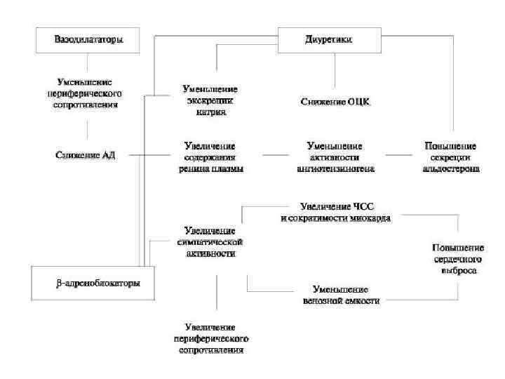 ВАЗОДИЛАТАТОРЫ 1. Артериолярные вазодилататоры: понижают общее периферическое сопротивление, непосредственно воздействуя на артериолы. Лекарственные препараты: гидралазин (апрессин), диазоксид (гиперстат), миноксидил ^ 2. Вазодилататоры смешанного действия: снижает периферическое сопротивление (действие на артериолы) и повышает венозную емкость (действие на вены), уменьшая таким образом пост и преднагрузку на сердце. Лекарственные препараты: нитропруссид натрия (ниприд) ^