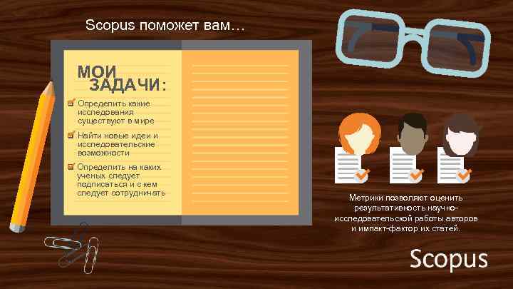 Scopus поможет вам… МОИ ЗАДАЧИ: q Определить какие исследования существуют в мире q Найти новые идеи и исследовательские возможности q Определить на каких ученых следует подписаться и с кем следует сотрудничать Метрики позволяют оценить результативность научноисследовательской работы авторов и импакт-фактор их статей.