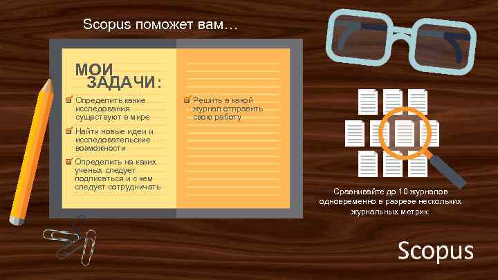 Scopus поможет вам… МОИ ЗАДАЧИ: q Определить какие исследования существуют в мире q Решить в какой журнал отправить свою работу q Найти новые идеи и исследовательские возможности q Определить на каких ученых следует подписаться и с кем следует сотрудничать Сравнивайте до 10 журналов одновременно в разрезе нескольких журнальных метрик.