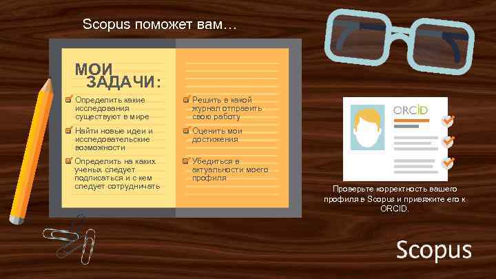 Scopus поможет вам… МОИ ЗАДАЧИ: q Определить какие q Решить в какой q Найти новые идеи и q Оценить мои q Определить на каких q Убедиться в исследования существуют в мире исследовательские возможности ученых следует подписаться и с кем следует сотрудничать журнал отправить свою работу достижения актуальности моего профиля Проверьте корректность вашего профиля в Scopus и привяжите его к ORCID.