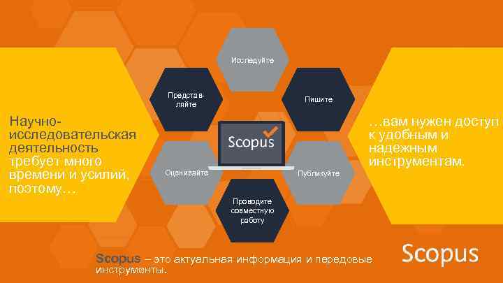 Исследуйте Представляйте Научноисследовательская деятельность требует много времени и усилий, поэтому… Пишите …вам нужен доступ к удобным и надежным инструментам. Оценивайте Публикуйте Проводите совместную работу Scopus – это актуальная информация и передовые инструменты.
