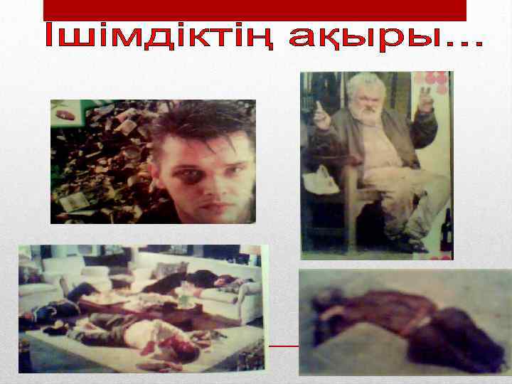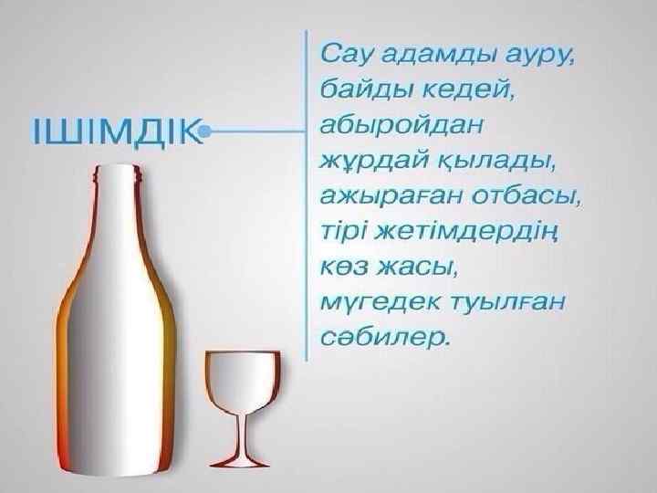 Ішімдіктің шығу тарихы Тарихи деректерге қарағанда жүзім шырынынан ішімдік алу сонау V-VІ ғасырларда болғаны байқалады. Бұл үрдісті жүзеге асырған көне заманның химиктері арабтар еді. Ішімдікке тәуелді адамдар Алкоголь — ес ауыстыратын зат деген мағына береді. Кейде алкоголь-рахаттану орталығы деген мағына береді. Алкоголь ағзаға қуат беретіні сөзсіз. Жүйке жүйелерін қоздыратын жасанды зат. Алкоголь миға бірнеше әсер етеді. Мида арнаулы түрде тұйық шеңбер құрылады. Қолайсыз сезімдер пайда болады. Адам неше түрлі ойға батып, әр түрлі ауыр қылмыстар жасайды.