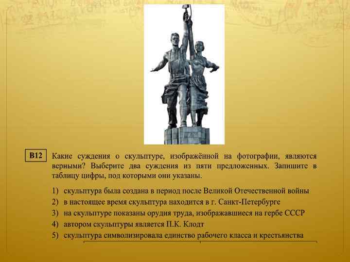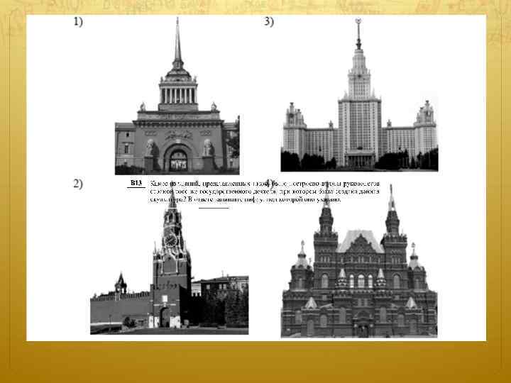 В 13 Какое из зданий, представленных ниже, было построено в годы руководства страной того же государственного деятеля, при котором была создана данная скульптура? В ответе запишите цифру, под которой оно указано.