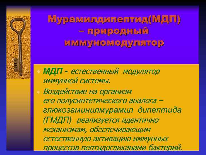 Происхождение, молекулярная природа и химическое строение глюкозаминилмурамил дипептида (ГМДП) • Искусственно полученное полусинтетическое химическое соединение пептидогликановой природы глюкозаминилмурамил дипептид(ГМДП) Гликопептид ГМДП является аналогом универсального фрагмента большинства бактериальных клеточных стенок мурамилдипептида (МДП).