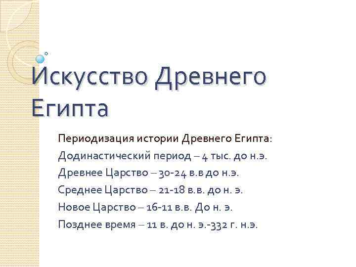 Искусство Древнего Египта Периодизация истории Древнего Египта: Додинастический период – 4 тыс. до н. э. Древнее Царство – 30 -24 в. в до н. э. Среднее Царство – 21 -18 в. в. до н. э. Новое Царство – 16 -11 в. в. До н. э. Позднее время – 11 в. до н. э. -332 г. н. э.