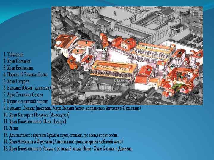Римский форум (лат. Forum Romanum) — форум (площадь) в центре Древнего Рима вместе с прилегающими зданиями. Первоначально на нём размещался рынок, позже он включил в себя комиций (место народных собраний), курию (место заседаний Сената), Храмы, Скульптуры выдающихся граждан, Трибуну и т. д. Эта площадь служила центром общественной жизни.