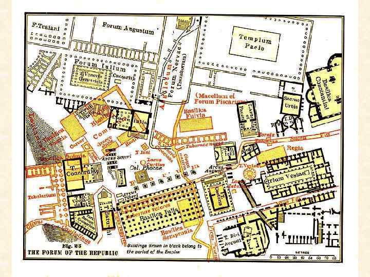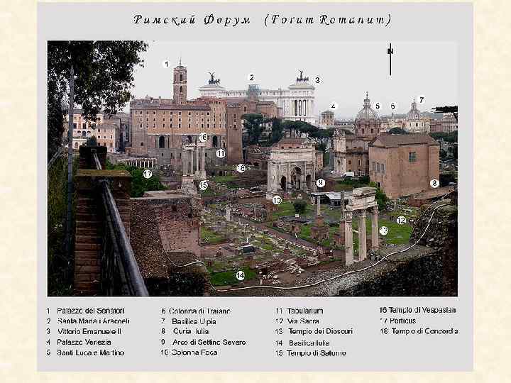 Форум Романум. План 1. Храм Согласия. 2. Храм Веспасиана 3. Храм Сатурна. 4. Форум Романум. 5. Базилика Юлил. 6. Храм Януса. 7. Храм Цезаря. 8. Арка Августа. 9. Храм Кастора и Поллукса. 10. Храм Весты. 11. Храм Антонина Пия и Фаустины. 12. Базилика Максенция. 13. Арка Тита.