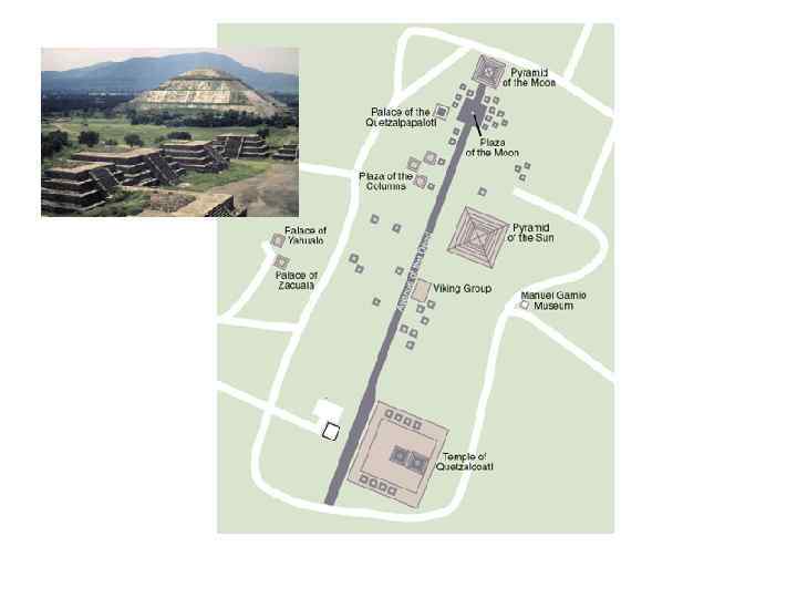 ТЕОТИУАКАН — заброшенный город, расположенный в 50 километрах к северо-востоку от города Мехико Теотиуакан стал региональным центром во 2 в. н. э. в результате того, что прежний центр, Куикуилько, был заброшен после извержения вулкана, а его жители переселились в Теотиуакан. Правильная сеть улиц, пересекающихся под прямым углом с центральным проспектом города, свидетельствует о том, что Теотиуакан развивался по тщательно продуманному плану. Вокруг центра находились близко расположенные друг к другу глинобитные жилища простых горожан, образующие отдельные городские кварталы, с узкими улицами и глухими стенами домов. Все дома были одноэтажными, с плоскими крышами и без окон. Единственным источником воздуха и света служили двери, обязательно выходившие во внутренний открытый дворик. В эпоху своего наивысшего расцвета (250— 600 гг. н. э. ) Теотиуакан оказывал значительное культурное влияние на многие области Месоамерики. Теотиуаканские глиняные сосуды и статуэтки встречаются от северных районов Мексики до гор Гватемалы и от Тихоокеанского побережья до Мексиканского залива. В эпоху расцвета своего могущества Теотиуакан контролировал центральные нагорья Мексики и поддерживал контакты с центрами соседних цивилизаций — Оахакой, Монте-Альбаном и городами-государствами майя (Тикаль). (Википедия)