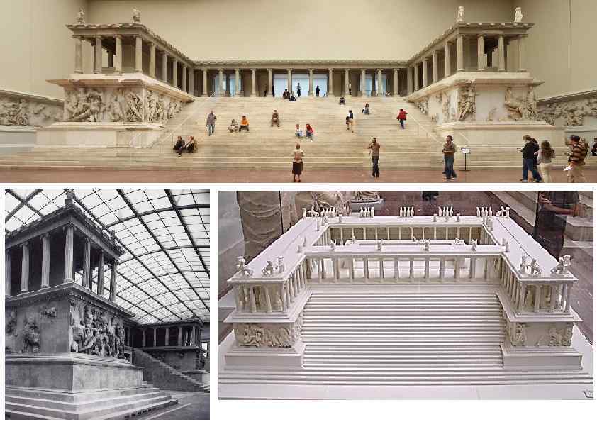 «Пергамский алтарь» —один из самых значительных памятников эллинизма, сохранившихся до наших дней. Создан в городе Пергаме в Малой Азии. Основная тема рельефных изображений — битва богов с гигантами. Ко входу вела широкая лестница, внутри алтарь был украшен рельефами на тему мифа о Телефе — сыне Геракла, который почитался царями Пергама как их родоначальник. Терраса алтаря находилась почти на двадцать пять метров ниже прочих зданий и была видна со всех сторон. Оттуда открывался вид на нижний город с храмом бога врачевания Асклепия, святилищем богини Деметры и другими сооружениями. Новшество состояло в том, что алтарь был вынесен за пределы храмов и превращен в самостоятельное архитектурное сооружение.