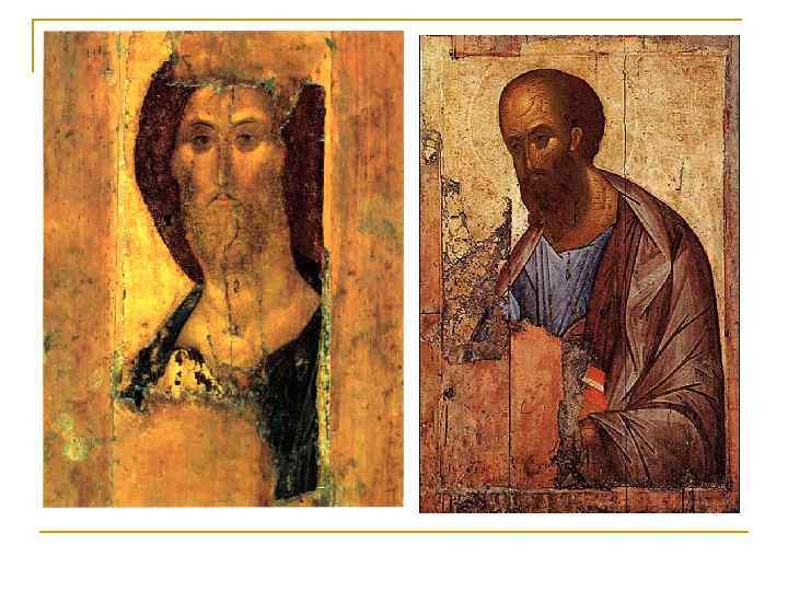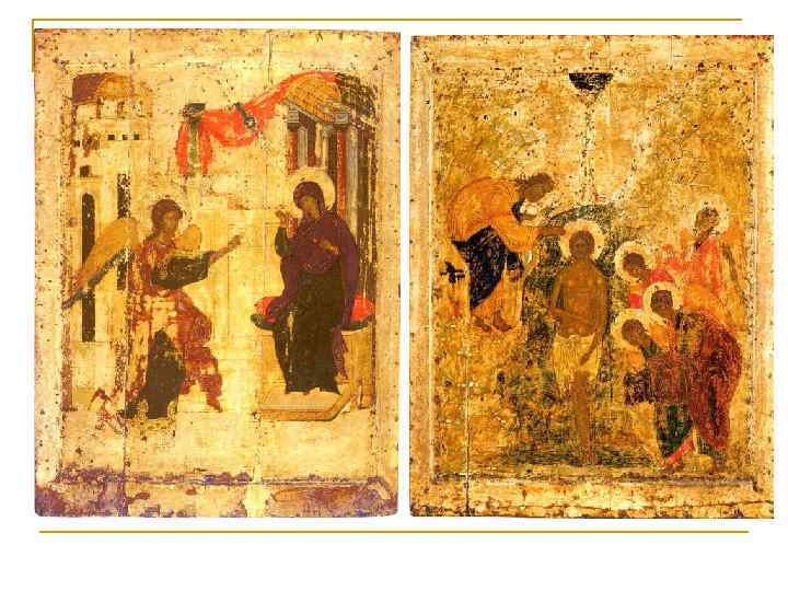 n n Иконостас – это «место стояния икон» , деревянная конструкция, заполненная установленными в определенном порядке рядами икон. Влияние искусства Андрея Рублева на формирование общерусского стиля прослежено в цикле работ: Праздничные иконы Благовещенского собора Московского Кремля, фрески и иконы Успенского собора во Владимире, иконы Троицкого собора Троицкого Сергиева монастыря и икона Троицы, Звенигородский чин.