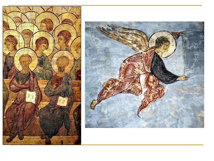 n n n Иконография – в средневековом искусстве устойчивая традиция изображения лиц и событий. Канон – система правил, освящённых церковью. В переводе с греческого означает «норма» , «правило» . Троица Ветхозаветная – изображение трёх ангелов, в образе которых Бог явился одному из праотцев, старцу Аврааму. Троица Новозаветная – изображение Саваофа с Иисусом Христом и со Святым Духом. Саваоф – первое лицо Троицы, Бог Отец, переводится с древнееврейского как «воинственный» , один из эпитетов ветхозаветного Бога Яхве.