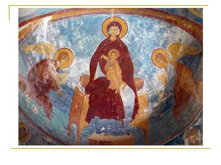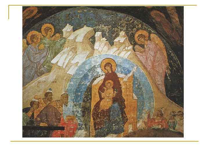 n n n Фрески собора Рождества Богородицы Ферапонтова монастыря иллюстрируют гимны Акафиста (25). Они сложены в VI веке византийским поэтом Романом Сладкопевцем. Тема круга повторяется в каждой композиции и всего цикла. Живопись передаёт ритмичность песнопения. Моделировать – в живописи создавать объём красочными средствами.