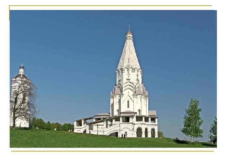 Развитие зодчества в XVI века. n n n Сложение столпообразного храма, использование восьмерика и шатрового покрытия, обогащение типа в церкви Вознесения в селе Коломенском (1532), Иоанна Предтечи в Дьякове (1547). Первая постройка воздвигнута по велению великого князя Василия III в память о рождении наследника. Второй храм возведён в честь венчания Ивана IV на царство.