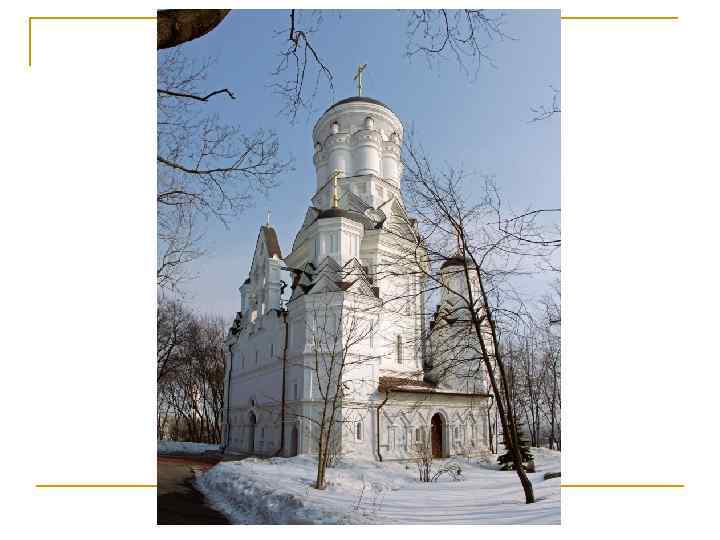 Культовая архитектура: храмы с декоративными шатрами на высоком арочном подклете с галереями определены как барочные. Так называемый "Нарышкинский стиль" последний этап в развитии древнерусского искусства в церкви Покрова в Филях (1690 -1693).