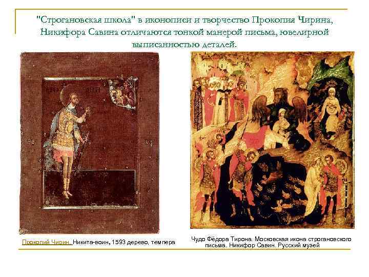 "Строгановская школа" в иконописи и творчество Прокопия Чирина, Никифора Савина отличаются тонкой манерой письма, ювелирной выписанностью деталей. Прокопий Чирин, Никита-воин, 1593 дерево, темпера Чудо Фёдора Тирона. Московская икона строгановского письма. Никифор Савин. Русский музей