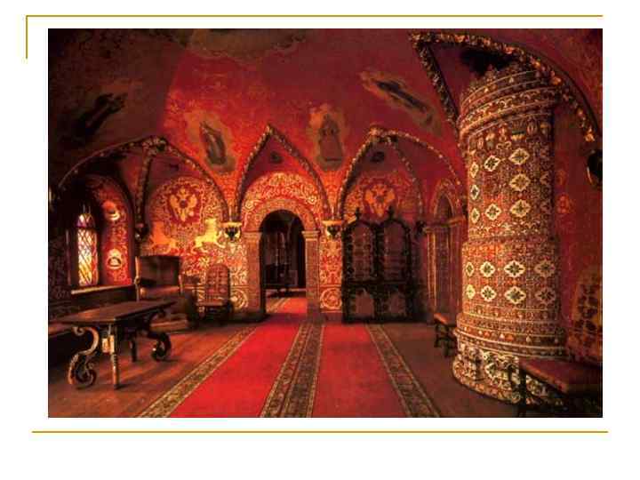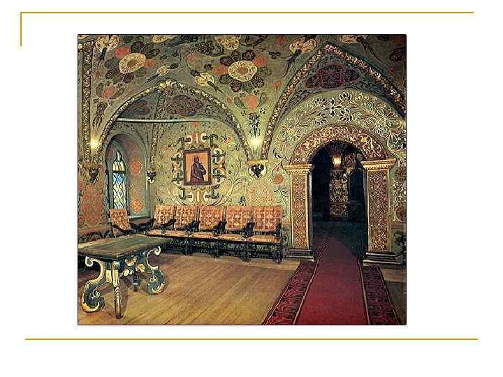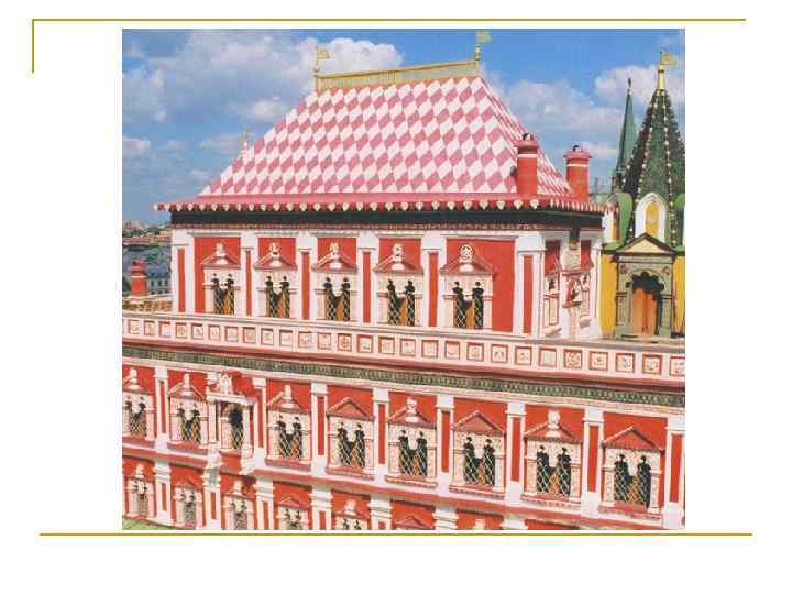 Русское искусство XVII в. n n Теремной дворец Московского Кремля (1635 -1636) построен Баженом Огурцовым, Антипом Константиновым, Трефилом Шарутиным и Ларионом Ушаковым. Новые черты в гражданском зодчестве связаны с новыми светскими формами. Причудливо украшены интерьеры дворца. Поливные изразцы венчают верхний ярус ступенчатого дворца.
