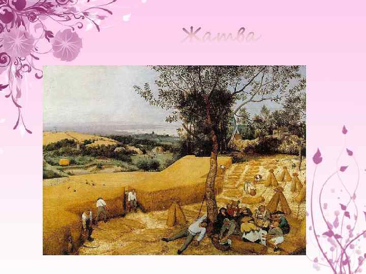 Большое место в его творчестве занимает пейзаж, где прекрасный и величественный мир природы предстает в тесном соприкосновении с жизнью людей: «Сенокос» «Жатва» «Охотники на снегу»