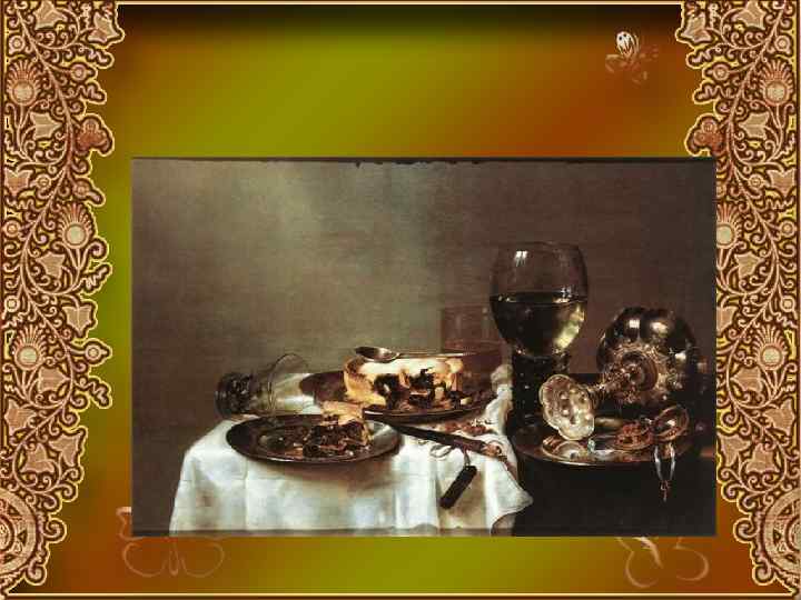 Жанровая живопись • В 17 веке появляется особый тип небольшой мелкофигурной картины. Темы – изображение веселящейся компании военных либо крестьянская тематика. Сюжеты играют незначительную роль и часто повторяются. Сцены служат лишь предлогом для передачи костюмов и поз.